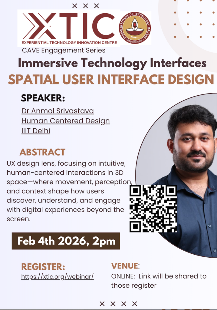 The Experiential Technology Innovation Centre (XTIC) at IIT Madras is hosting an exciting webinar as part of their CAVE Engagement Series, focusing on the intersection of immersive technologies and spatial interface design. This series explores how emerging technologies are reshaping digital experiences and human-computer interaction in three-dimensional environments.